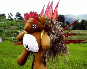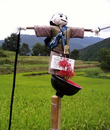 彼岸花は秋の彼岸に咲くことからこの名前が付けられているが、曼珠沙華とも呼ぶ。明日香の村は何処を歩いてもこの真っ赤な花が迎えてくれる。稲穂とのコントラストがはっきりしていて鮮烈。花の時期に合わせてかかしのコンクールも開かれ、ユーモアたっぷりの作品が並ぶ。
