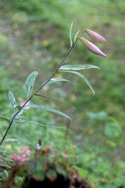 ササユリはその年によって異なるそうだが、白、朱、そして淡いピンクが見られる。住宅の裏庭にも自生しているほど、ササユリは地域に密着していました。